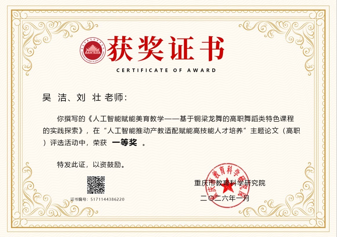 近日,重庆市教育科学研究院公布了“人工智能推动产教适配赋能高技能人才培养”主题论文及典型案例评选结果。我院教师在本次评选中表现突出,展现了在人工智能与教育教学融合方面的积极探索。论文类奖项中,吴洁和刘壮老师的《人工智能赋能美育教学——基于铜梁龙舞的高职舞蹈类特色课程的实践探索》,将非物质文化遗产铜梁龙舞与现代人工智能技术相结合,探索了传统艺术在数字时代传承与创新的路径,荣获一等奖。