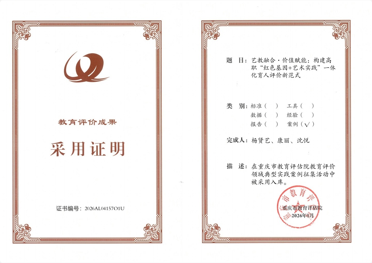 根据《重庆市教育评估院关于公布教育评价领域典型实践案例评选结果的通知》(渝教评院函〔2026〕4号),我院2篇教育评价案例入选重庆市教育评估院案例库,分别是:杨贤艺、康丽、沈悦撰写的《艺教融合·价值赋能:构建高职“红色基因+艺术实践”一体化育人评价新范式》,宗引、黄娅、胡鰆月撰写的《“我会教非遗”——高职艺术教育专业<小学美育>项目式课程中的教学胜任力增值评价实践》。